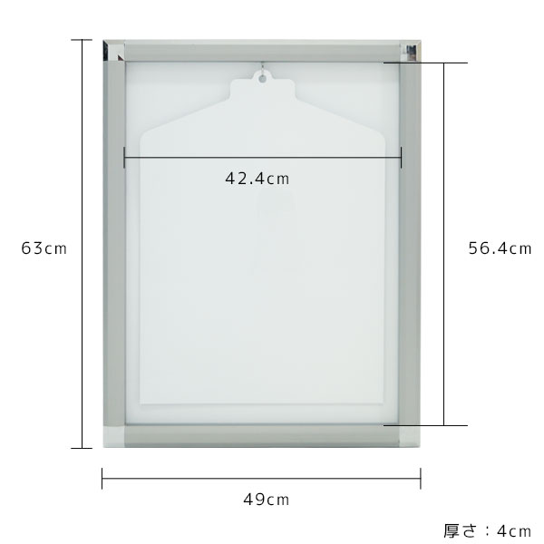 【商品仕様】 外寸:幅49cm×高さ63cm、厚み3.7cm 内寸:幅42.4cm×高さ56.4cm、厚み1.7cm ハンガーサイズ:高さ52cm×幅38cm フレーム素材:ASB樹脂 全面パネル素材:アクリル樹脂(UVカット) 背面板、ハンガー素材:PP(プラパール) 付属品:ねじ穴隠しキャップ、壁掛け金具(石膏専用) 総重量:2.0kg 【生産国】 日本 【備考】 ※実際の商品の色にできるだけ近づけるよう撮影を行なっておりますが、商品の色はご使用のモニターによって実際の明るさや色と多少異なって見える場合がございます。